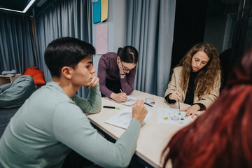 A group of students work together in a modern classroom, engaging in a creative brainstorming session. Ideal for educational themes or collaborative learning images illustrating teamwork and