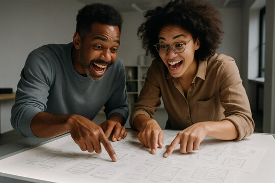 Creative team collaborating on blueprints with digital overlay