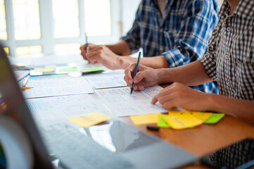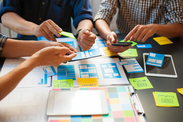 Designers meeting, brainstorm and discuss web and mobile app design.