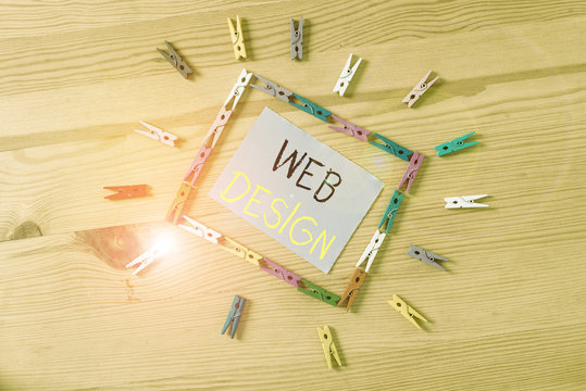 Word writing text Web Design. Business photo showcasing Website development Designing and process of creating websites Colored clothespin papers empty reminder wooden floor background office