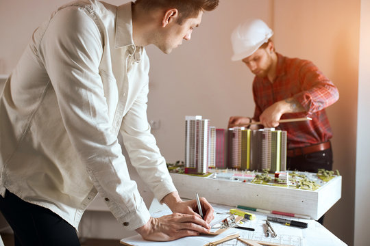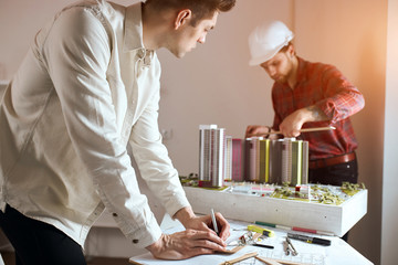 two colleagues measure small model with measuring tape and making notes, close up photo. team work, partnership. common ideas and plan, architects developing business