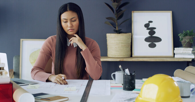 Thinking, architect and woman with blueprint, office and ideas for architecture project or creative. Reflection, civil engineer and Asian person with vision for property development or floor plan