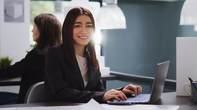Portrait of asian creative employee working on interior design ideas, searching for remodeling inspiration on laptop. Woman architect developing new floor plans for client house, industrial agency.