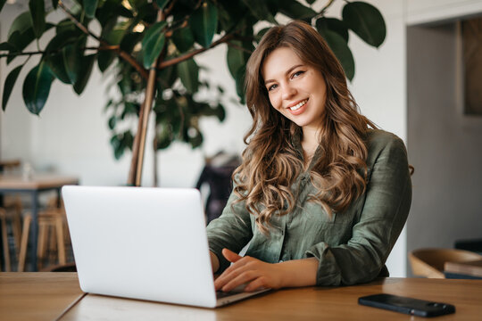 Creative and office work. A young woman posing in the workplace. On the table is a graphics tablet and a computer
