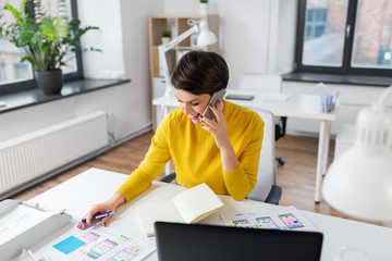 business, technology and ui design concept - smiling creative woman with user interface templates calling on smartphone and writing to notebook at office
