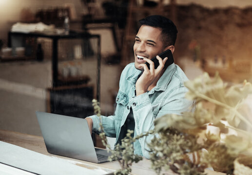 Creative man, phone call and laptop laughing at cafe for communication, social network or funny conversation. Happy male freelancer laugh for joke or startup on smartphone at coffee shop restaurant