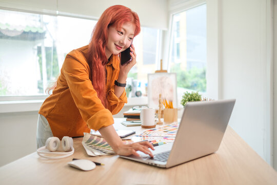 Smiling Asian female graphic designer talking on mobile phone and using laptop at creative workspace.
