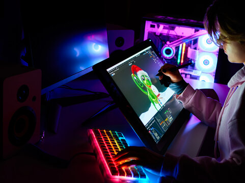 Female 3D designer is working on a project on a graphic tablet with a screen. Digital designer creates a model for a video game or cartoon