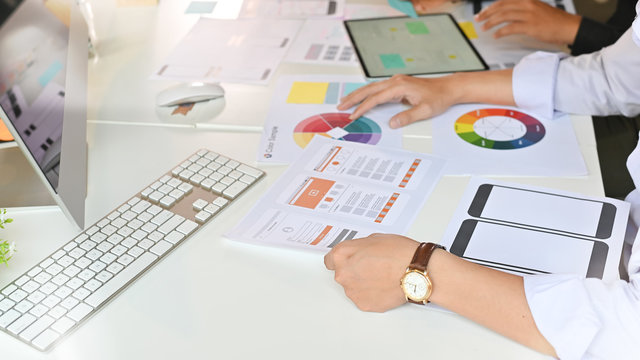 Teamwork process, Young designers planning work together on website ux app development.
