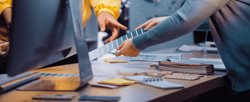Creative graphic designer analyzing color swatch at workspace