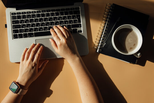 Office flat lay with pen and notebook placed on a light orange background. Business flat lay