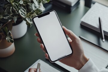 Mockup of a blank iPhone screen held by a person against a green background with a plant and notebook