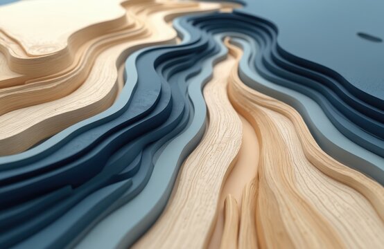 Abstract 3D topographic map features flowing blue and beige layers with detailed contours. Layers show wooden texture, mimicking natural terrain and elevation changes.