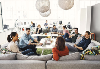 Multiracial group of young creative people in smart casual wear discussing business brainstorming meeting ideas mobile application software design project in modern office. Coworker teamwork concept.