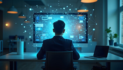 Business professional analyzing data with technological overlays in modern office