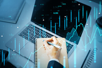 Analyzing financial data on laptop at modern workspace