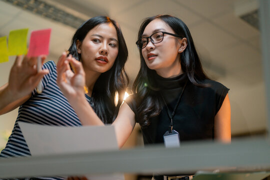 Businesswomen analyzing project planning using sticky notes on glass wall in the office