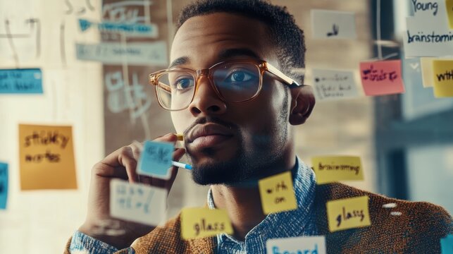 A focused professional analyzing sticky notes on a glass board during a brainstorming session, capturing creativity and problem-solving energy.