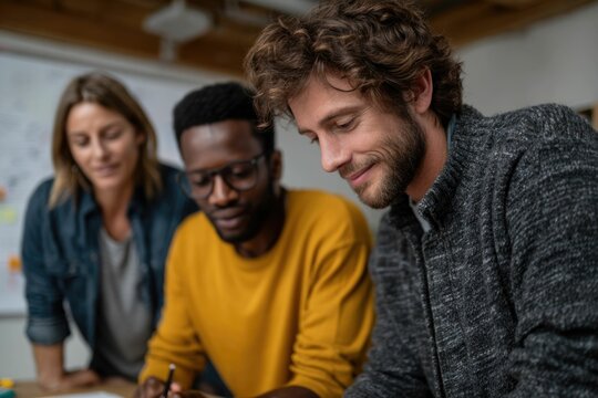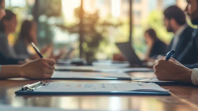 Collaborative brainstorming session, team gathered around table for strategic planning and idea generation