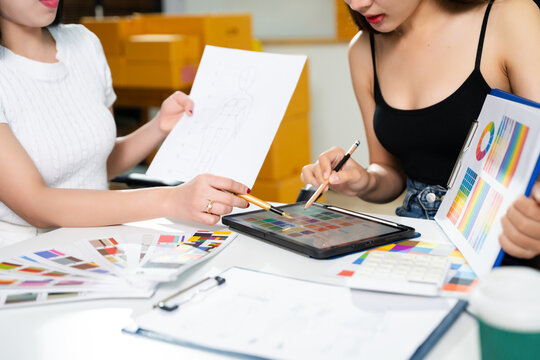 Fashion designers collaborating with color palettes, sketches, and digital tools in a studio. Creative design process, branding, textile planning