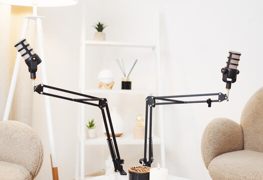 Two microphone stands positioned for a podcast recording in a modern, cozy setting with light decor