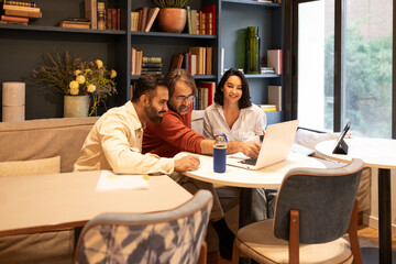 Diverse professionals collaborating on laptop in modern workplace