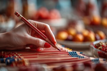 A close-up of a hand holding a red and gold colored pencil over a stack of American flag themed pencils, with a blurred background of fruits and snacks.