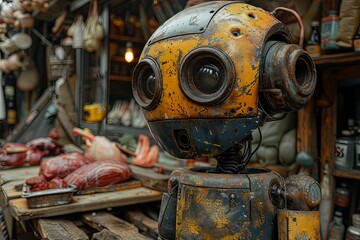 Realistic Anime Movie Poster Portrait: Cyberpunk Automaton in a Meaty Butcher Shop