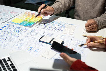 Creative digital development agency. developer team brainstorming on their project with laptop, smartphone and digital tablet.