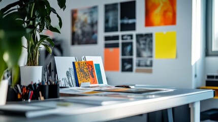 A professional workspace with creative mood boards and vibrant decor