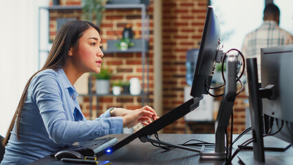 Asian female engineer using touchscreen display to create game interface on professional software. Creative developer working with artificial intelligence to plan 3d render production.