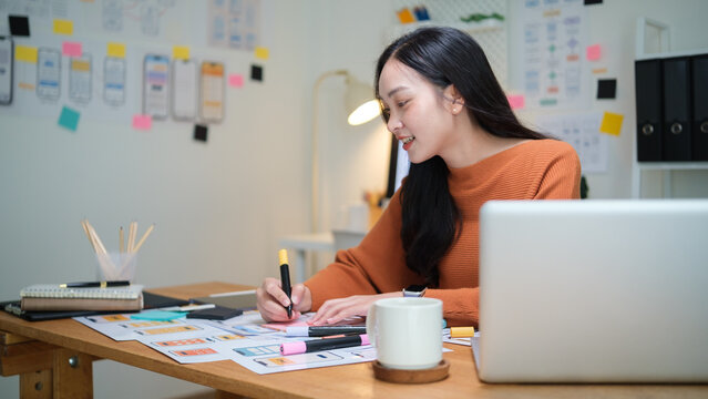 Close up ux developer and ui designer brainstorming interface wireframe design.Creative digital development agency