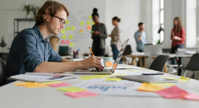 Creative brainstorming session with colorful post it notes and markers in modern office environment showcasing teamwork and innovative ideas