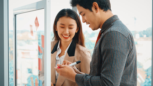 Casual creative happy two smile asian business people planning strategy analysis and brainstorm putting post it stickers note to share idea for startup project on glass board at modern office
