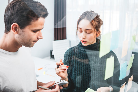 Business people work on project planning board in office and having conversation with coworker friend to analyze project development . They use sticky notes posted on glass to make it organized. Jivy