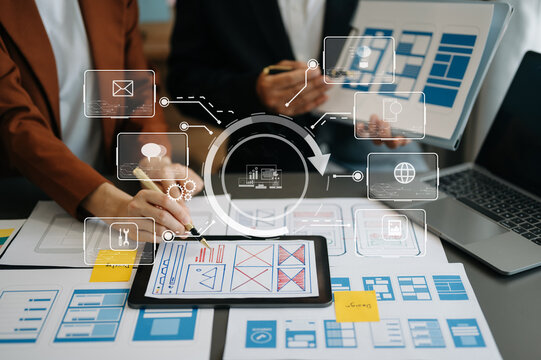 Close up view of UI developer team brainstorming on their project with laptop, smartphone and digital tablet. Creative digital development agency. with virtual icons