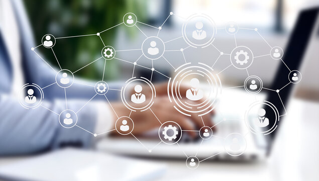 A modern workspace integrates digital tools and human elements, fostering collaboration among remote teams. The environment highlights flexibility, AI resources, and a focus on productivity