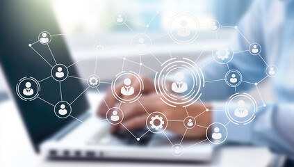 Image of network of connections with icons over diverse colleagues discussing work in office