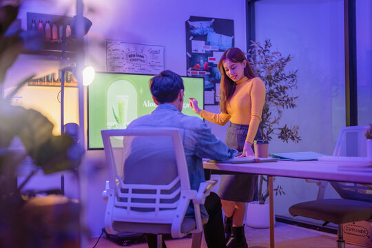 high octane late night office session dedicated agile team comprising the product manager strategist planner advanced AI agent assistance collaboratively brainstorms and conducts meticulous market