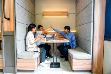 Diverse team celebrating success with a high five. A positive, energetic office scene conveying teamwork, achievement, and collaboration. Perfect for business  corporate communications.