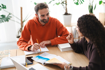man and a woman engage in an intense discussion, possibly brainstorming or problem-solving. They sit across from each other with a laptop and books, indicating a collaborative or creative environment.
