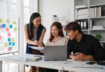 Asian colleagues collaborating on digital project in modern office