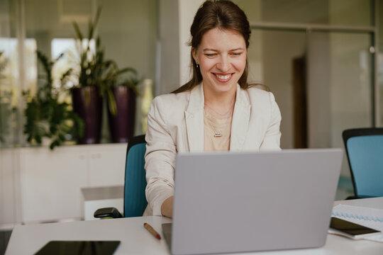 A professional woman is successfully working collaboratively in a modern office setting today