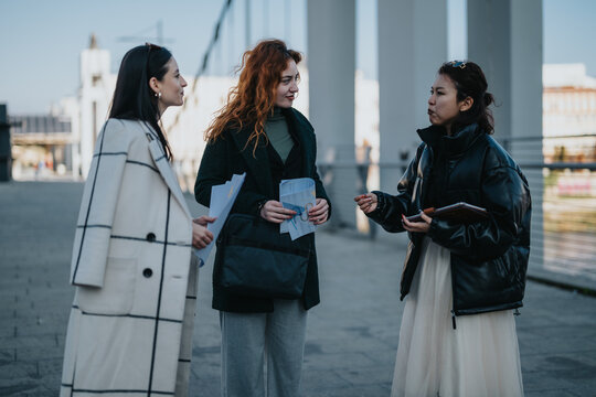 Diverse women engaged in conversation, collaboratively working on a project strategy in an outdoor urban setting. The scene portrays teamwork, analysis, and mutual understanding in a city environment.