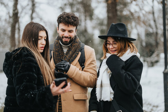 A group of young business teammates collaboratively working on a project outdoors, using a smart phone in a snowy urban park.