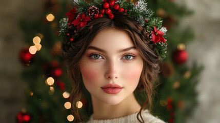 A beautiful woman wearing a floral crown amidst a festive holiday backdrop, radiating warmth and seasonal cheer.