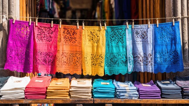Colorful woven textiles stacked on shelves in a local market during the daytime in a vibrant artisan shop