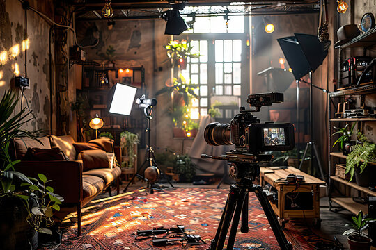 Smiling female vlogger recording livestream with ring light, dslr and studio lighting
