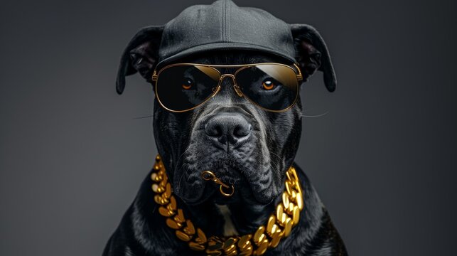 Hip hop gangster dog with cap, shades, gold chain on gray background, ideal for animal banner design