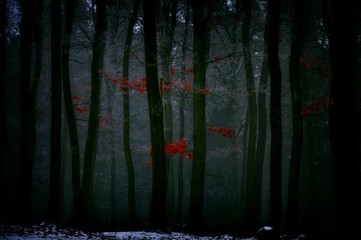 Mysterious foggy forest covered with glaze ice and rime. Fog,oak trees with red leafs,woodland, winter landscape.  Czech republic,Europe.  .